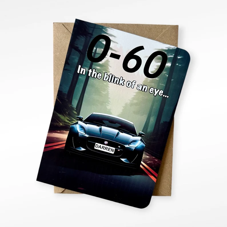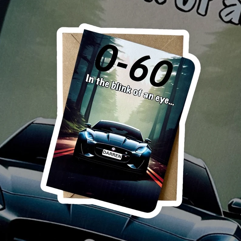 Featuring a bold Jaguar F-Type illustration and the statement “0–60 in the blink of an eye”, this card includes a custom registration plate that can be personalised with a name, creating a distinctive and memorable gift for car enthusiasts.